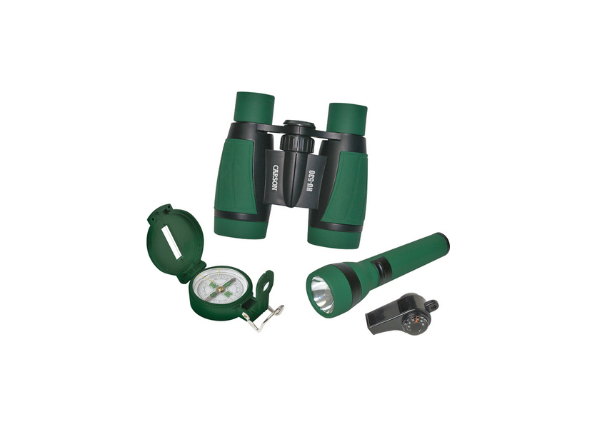 Everything you need for great adventures! Perfect for backpacking, biking, camping and all forms of exploration. Includes a compact 5x30mm binoculars with forest green rubber armour and neck strap. 5 3/4″ overall flashlight with forest green composition housing and lanyard ring. Uses two AA batteries (not included). 2 7/8″ overall lensatic compass with true hand-bearing triangulation capabilities and forest green composition housing. 2 1/4″ overall combination signal whistle/thermometer with black composition housing and lanyard. Black nylon carrying case to hold all with lens cleaning cloth. Weighs 20 oz.